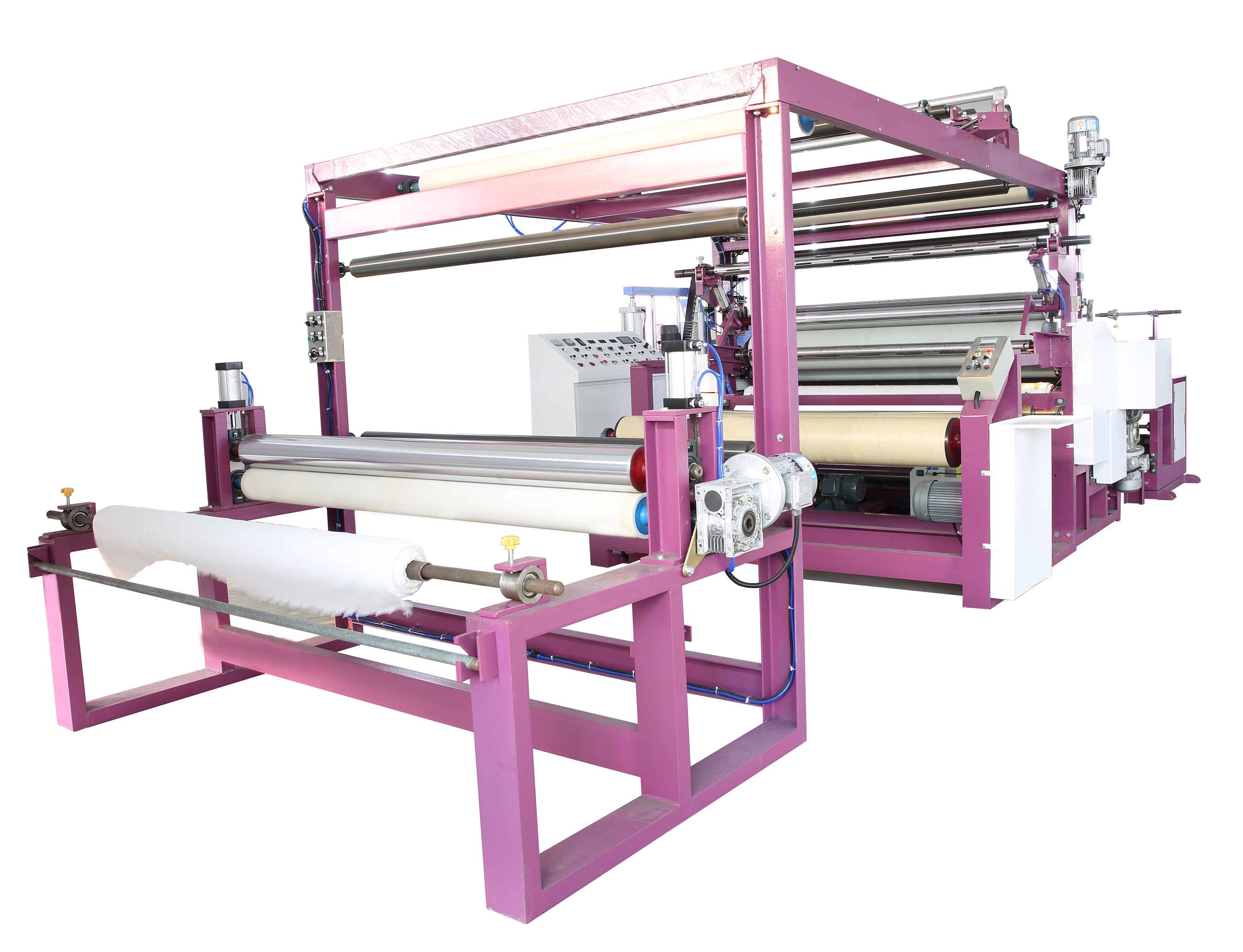 充氣材料復合設備是專門用于制造層壓結構充氣產(chǎn)品的核心工業(yè)裝備。其核心功能在于將兩種或多種基礎材料(如涂層織物、薄膜、無紡布、增強網(wǎng)布等)通過涂布粘合劑(或熱熔膠)并精確復合在一起,最終形..